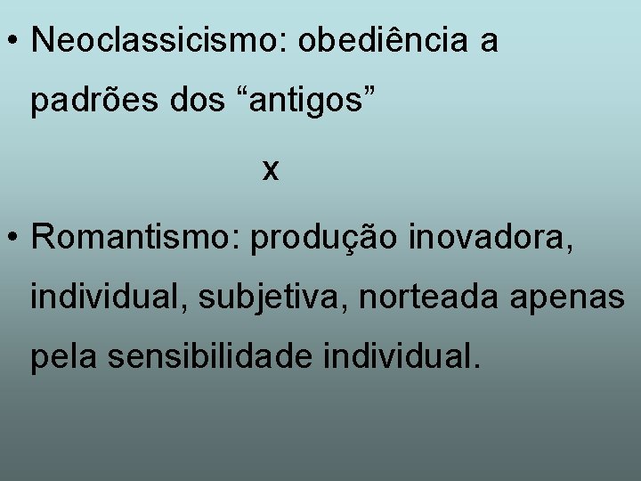 O neoclassicismo enfatizou a estrutura a contenção e a objetividade enquanto o romantismo enfatizou a imaginação a emoção e a subjetividade. No Neoclassicismo há um predomínio da razão um culto às formas clássicas um apego à mitologia um aspecto mimético imitação da natureza. NEOCLASSICISMO X ROMANTISMO.